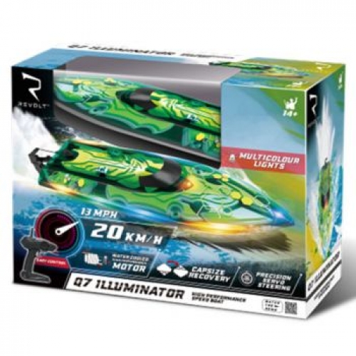 "Make waves at 25 KMH with The Illuminator High Speed RC Boat (35.2cm/13.9in. Long). Features waterproof, multi-colour light up hull with capsize recovery, water-cooled motor and 150 meters (500 ft.) range. Remote control with LCD display showing remaining power level. Includes rechargeable 7.4V (600 mAh) Li-ion battery. Not intended for use in salt water. Remote control requires 4 ""AA"" batteries (not included)"