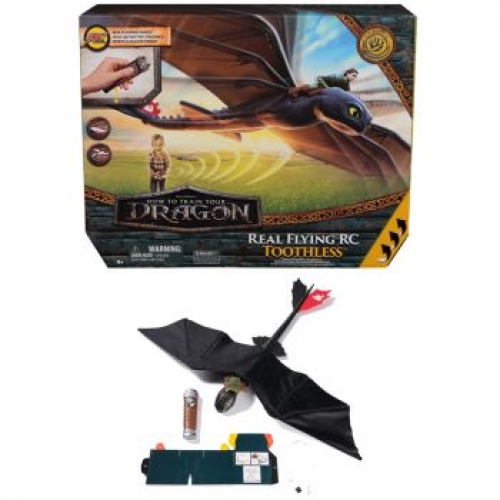 Take flight with Real Flying RC Toothless from How to Train Your Dragon. This remote-controlled dragon toy brings the adventure into your home and features real flapping wings, made of lightweight durable foam material and adjustable tail to control his flight path. Once assembled, get ready to watch Toothless soar in the air by using the easy-to-control throttle remote control to maintain speeds. Includes a 2.4GHz controller with a range of 250 feet so adventurers, young and old, can command Toothless on epic adventures. Get up to 10 minutes of flight time on a single charge. Use the packaging and the included USB-C cable as a charging station for your RC Toothless to keep the fun going. Start your adventures with ideal pretend play toys for ages 5-7. Whether it's a birthday, holiday, or any celebration, this dragon figurine is an exciting option for young fans to inspire imaginative play and heroic adventures. Explore more thrilling adventures with Battle Dragons action figures, flying RC Toothless airplane toys, board games, toy figures & playsets, Vikings figurines, stuffed animals and plush toys. (Each sold separately.)