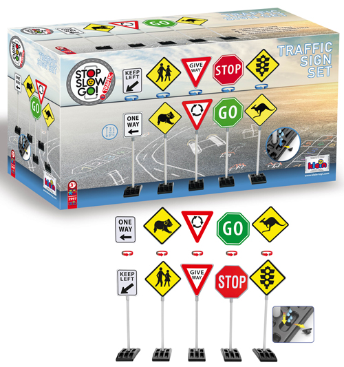 Set consists of 5 stands and signs. Signs are double sided giving you 10 actual signs. AGE 3+