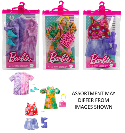 Dress Barbie® for anything -- this cool collection of doll clothes is as versatile as she is! The complete looks offer her unique twists on today's trends. Each fashion pack features one outfit and two accessories to dress Barbie® doll. Mix and match with other Barbie® clothing, shoes and accessories in the line to create different looks and explore style. Includes one outfit (one dress or a top and bottom) and two accessories; doll sold separately. Universal fit designed to fit most Barbie® dolls. Each fashion pack sold separately, subject to availability. Colors and decorations may vary.